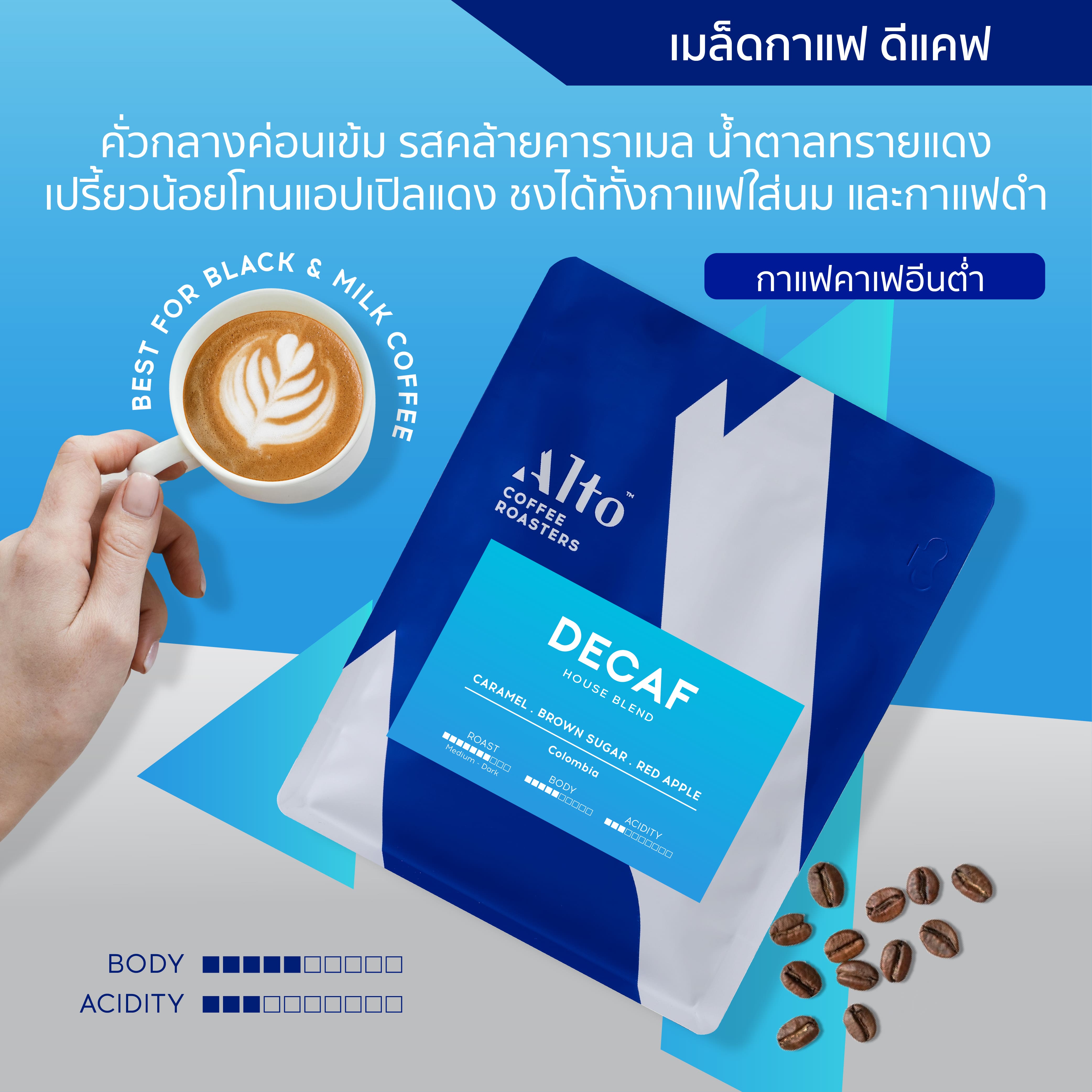 Decaf (ดีแคฟ) เบลนเหมาะสำหรับคนที่ชื่นชอบการดื่มกาแฟ ได้เสพกลิ่นและรสกาแฟ แต่ไม่ต้องการสารคาเฟอีน