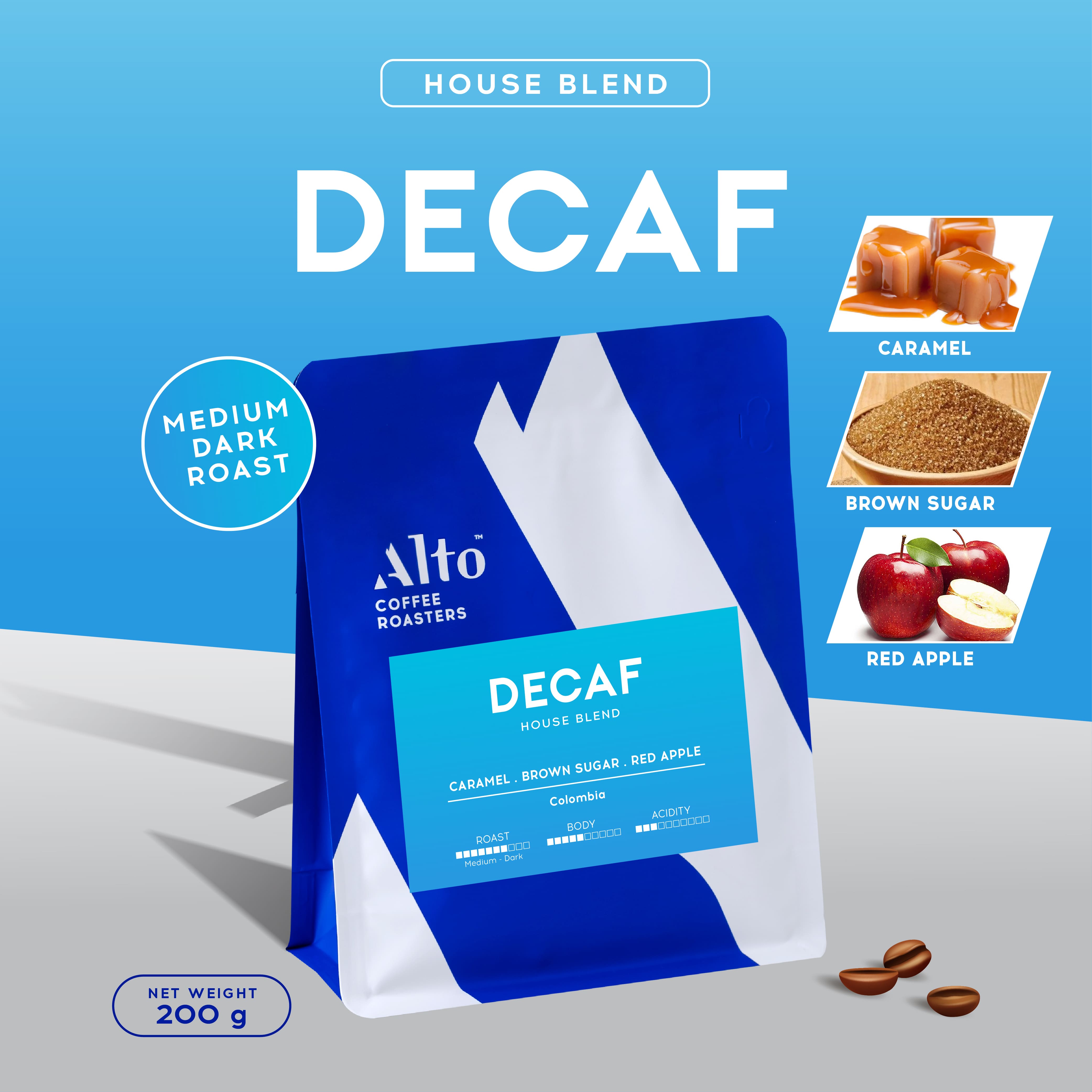 กาแฟดีแคฟของเราคั่วในระดับกลางค่อนเข้ม ให้โทนรสชาติหวานโทนคาราเมล และน้ำตาทรายแดง เปรี้ยวโทนแอปเปิลแดง ดื่มง่ายเหมือนกาแฟปกติ